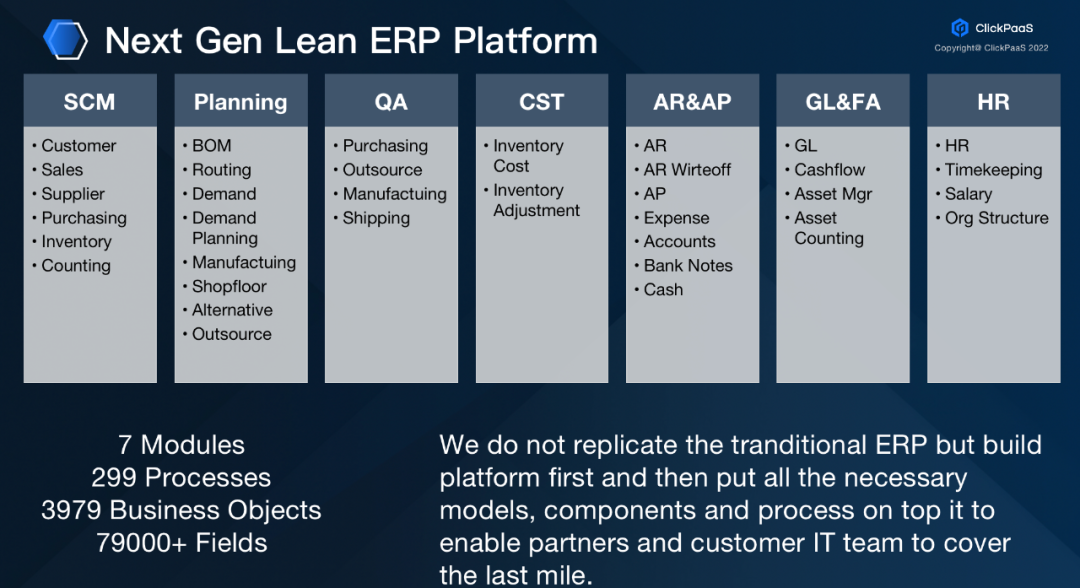 ng28电子游戏官网入口把这样的逻辑同样应用到了工业领域。比如在纷繁复杂的泛ERP场景中,ng28电子游戏官网入口把ERP场景中的核心模型内置在元数据模型平台上,并不是复制一个传统ERP,而是把核心的模型、组件、流程开放性的构建完善,支持ng28电子游戏官网入口的伙伴和客户通过一个瘦身的Lean ERP Platform进行扩展开发的逻辑构建最后一公里的业务实现。